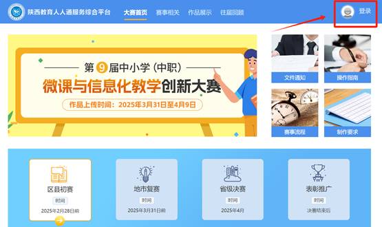 省级决赛作品上传期间(2025年3月31日—4月9日),打开陕西省微课与信息化教学大赛官网(http://weike.sneduyun.com),使用“陕西教育人人通综合服务平台”账号密码,点击右上角“登录”按钮。