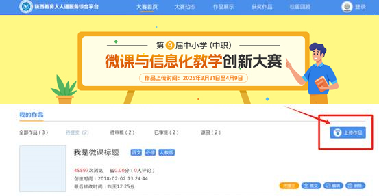 报名成功后点击“我要参赛”进入到作品上传页面,点击“上传作品”依照提示完善作品信息。