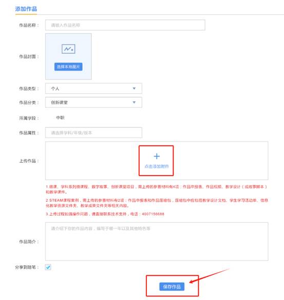 在“上传资源”处点击“+”号,进行课程资源附件上传,上传完成后点击“保存”,附件上传成功,最后点击“保存作品”,作品上传成功。