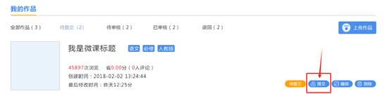 作品上传成功后进入“我的作品”页面,您可以看到您上传的作品,已上传成功的作品,需要进行提交后,才能被管理员及其它用户看到,点击向上箭头标志,即可进行作品提交,若需要对作品重新编辑或者删除点击相应按钮即可操作,提交后的作品教师不可再进行编辑或者删除操作。
